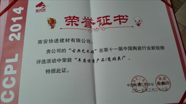 熱烈祝賀協(xié)進陶瓷古典藝術(shù)磚在號稱“中國陶瓷行業(yè)奧斯卡”評選活動中榮獲年度優(yōu)秀產(chǎn)品獎。