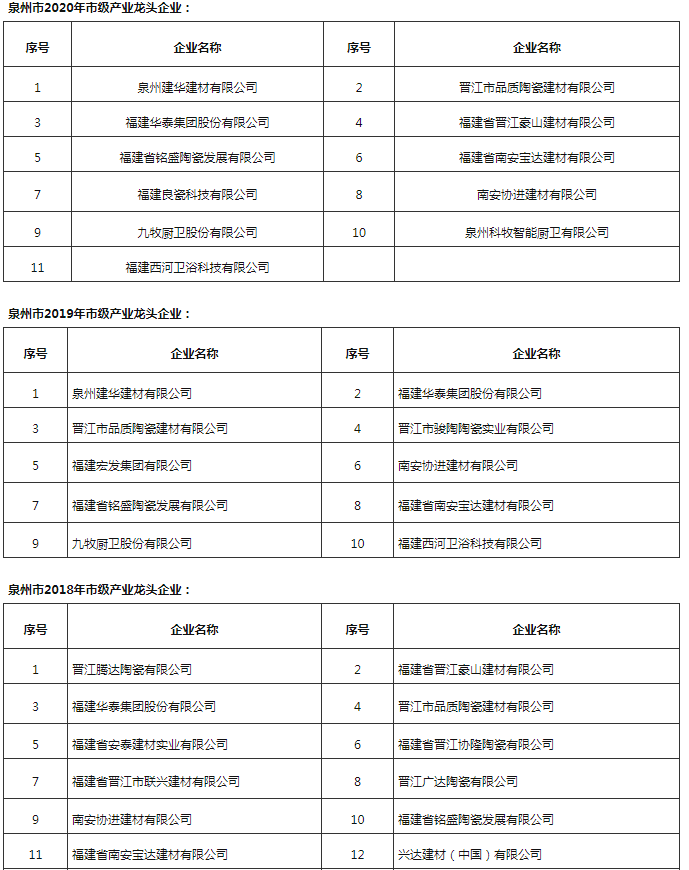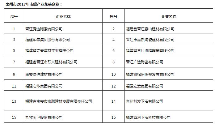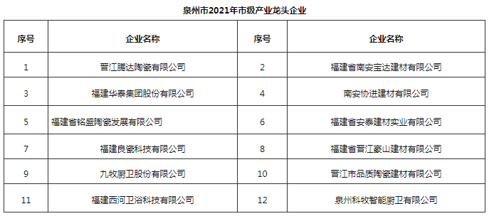 其中,建材家居行業(yè)中,協(xié)進(jìn)、九牧等12家福建陶衛(wèi)企業(yè)進(jìn)入2021年泉市級(jí)產(chǎn)業(yè)龍頭企業(yè)項(xiàng)目名單。